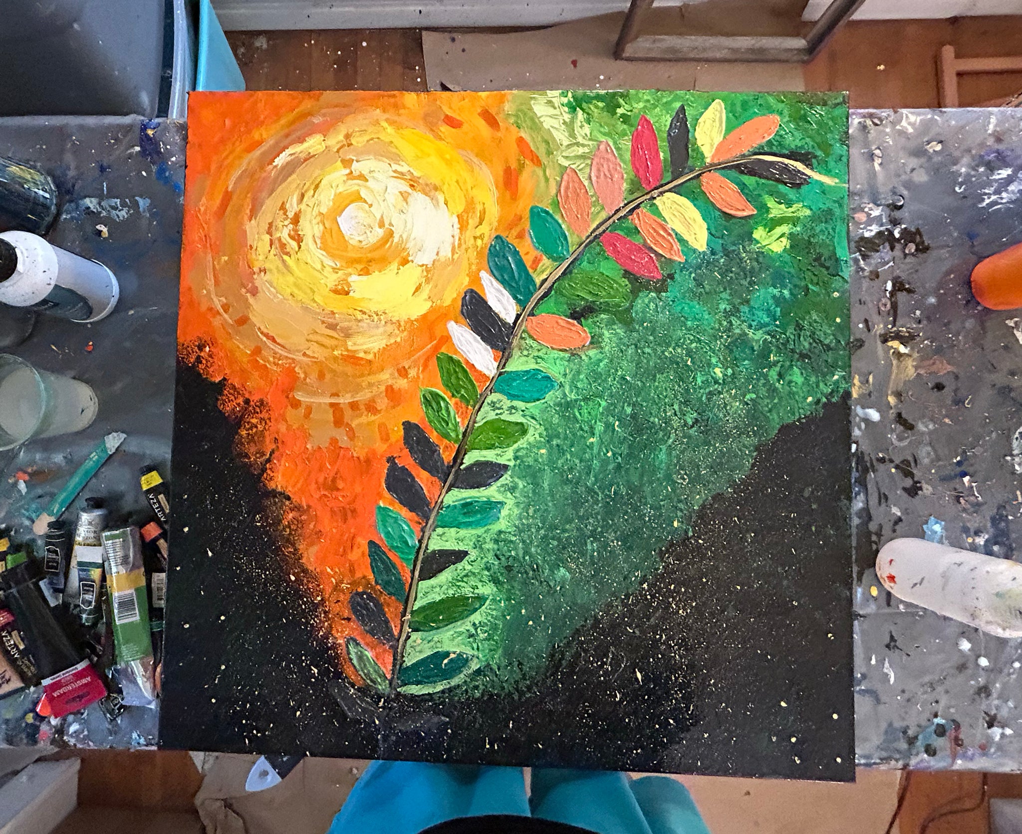 Acrylic on gallery-wrapped canvas, it’s ready to hang without a frame (though you may add one if you wish). A glossy varnish protects the colors, so they will stay bright and alive for years to come.